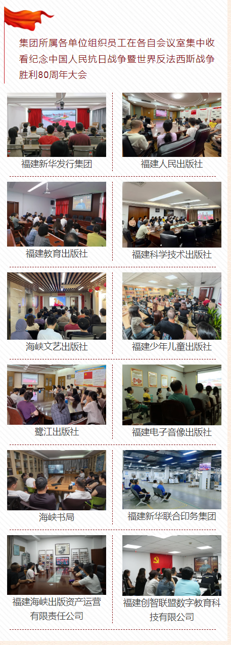 2025年9月3日是中國人民抗日戰爭暨世界反法西斯戰爭勝利80周年紀念日。海峽出版發行集團組織全體在職干部職工集中收看紀念中國人民抗日戰爭暨世界反法西斯戰爭勝利80周年大會,認真學習習近平總書記在大會上的重要講話精神,共同見證閱兵盛典。